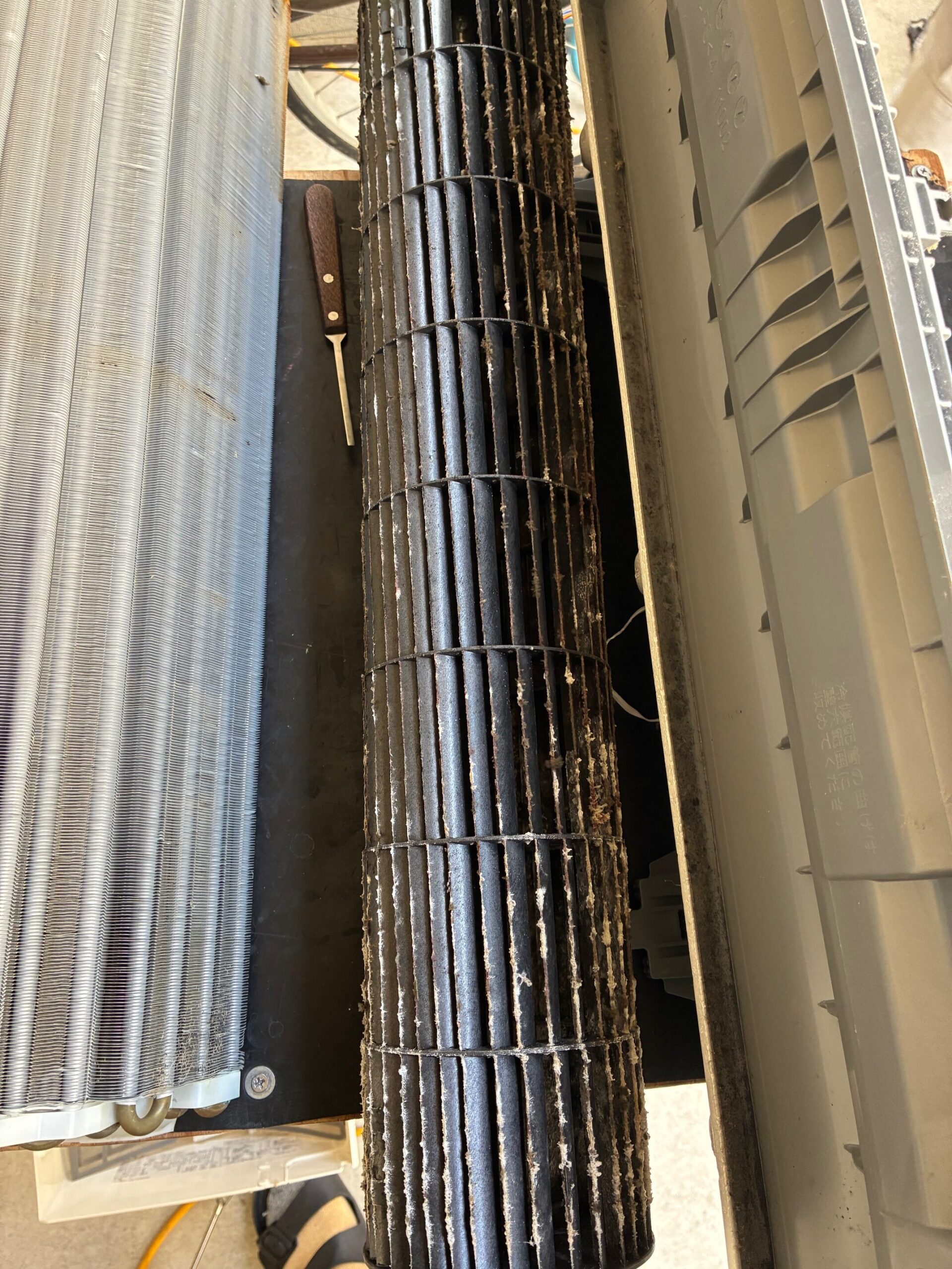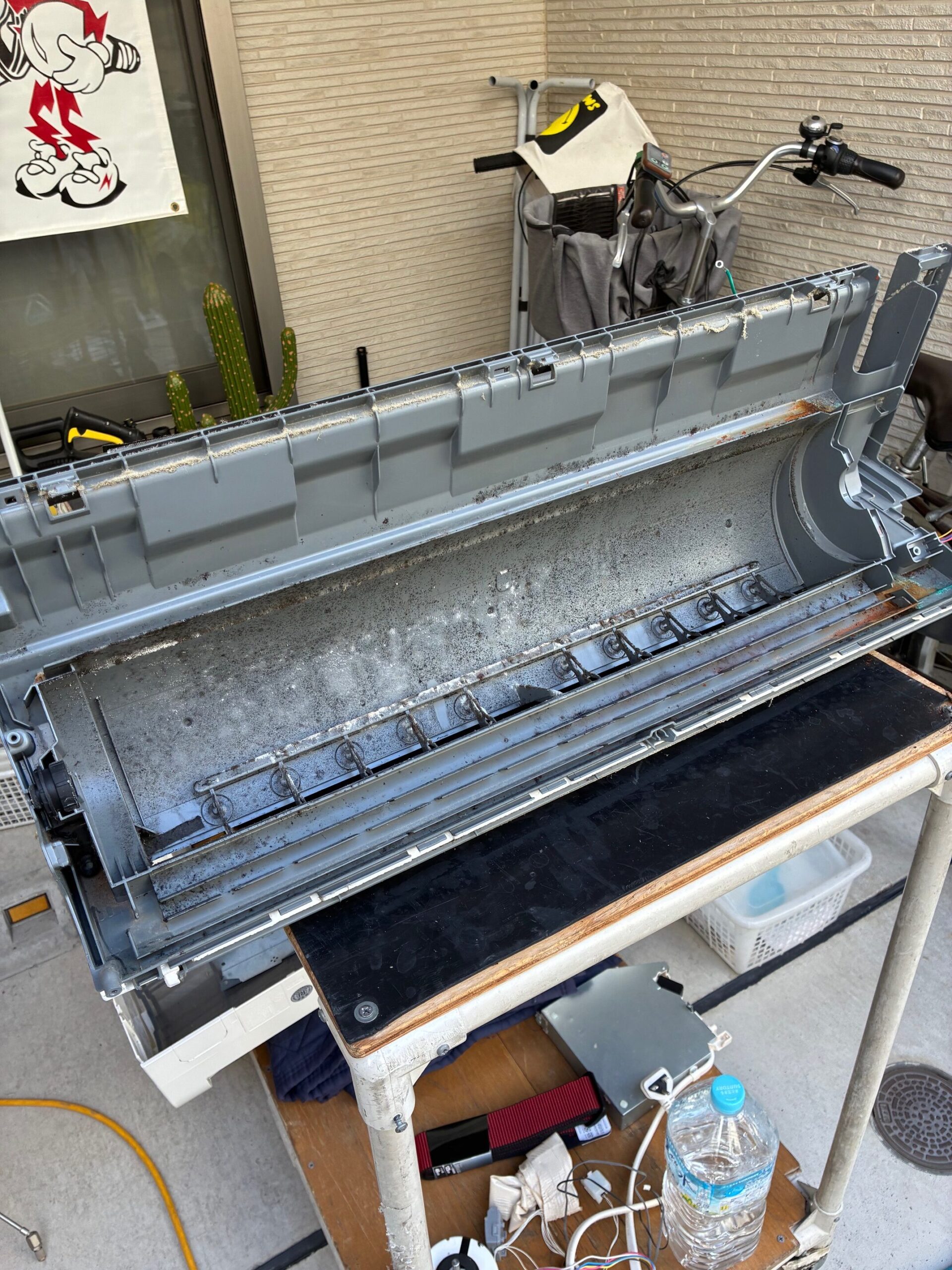 下から除くとめちゃくちゃカビの汚れがひどく、そろそろ綺麗にしたいなと思い、何年も前に一度お願いした事のある、当時は特に珍しかった完全分解のエアコンクリーニングの業者さんにお願いしました。